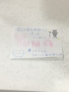 毎月定期検診に来てくれてる小学生の女の子が、自分の名札を作っていました。先生達は名札作らないの?と私にくれました。いい案をありがとう😊